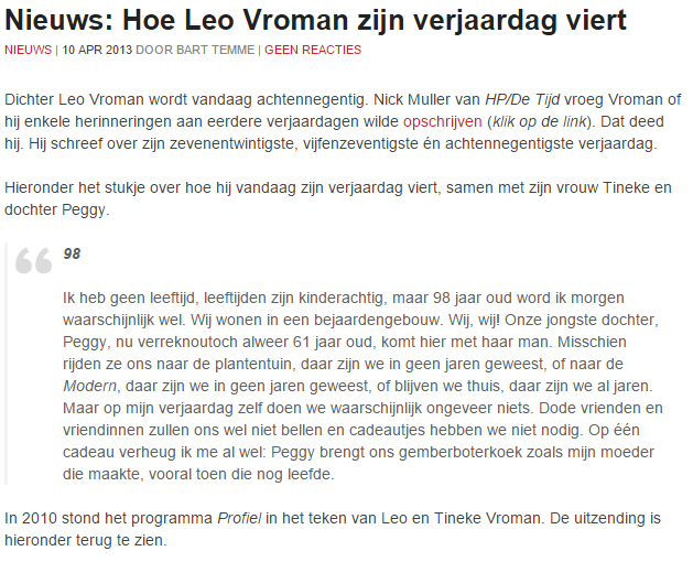 Dichter en wetenschapper Leo Vroman is op 10 april jarig. En dat is hij al bijna honderd jaar. Speciaal voor HP/De Site schrijft Vroman over drie memorabele verjaardagen, verdeeld over drie fases in zijn leven. 27, 75 en 98