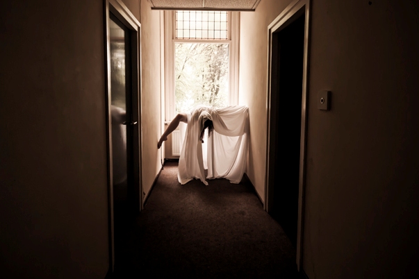“Bedekken, verdwijnen, blootgeven en verhullen: het zijn zomaar wat begrippen die ik sober probeer te verbeelden in mijn fotoseries. Ik maak foto’s van een individu in een huiselijke omgeving en bevraag hierbij de plek en identiteit van de mens door deze fysiek samen te laten vallen met de omgeving. Zoals bijvoorbeeld met kleding. Wat betekent schoonheid, kan men zich daarmee kleden? Neemt schoonheid toe bij het verder verhullen of juist bij het zich ontdoen van de kleding? Ik geef dat gevecht weer tussen het naakt en kwetsbaar zijn en het verbergen met materialen. Laag na laag probeer ik in de buurt te komen van wat ik denk dat de maatschappij van ons mensen verwacht. En elke stap is er een, dichterbij en verder van de realiteit af.”