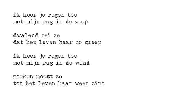 ‘Gevoel speelt een belangrijke rol in mijn werk. In mijn gedichten komen vaak thema’s als verlangen, verdriet en intimiteit aan bod. Soms zijn het ook vluchtige momenten die ik in woorden probeer vast te leggen. Als ik ga fotograferen, probeer ik er eerst achter te komen waar mijn gedicht nou werkelijk over gaat. Vanuit daar ga ik te werk met mijn camera. Ik probeer deze emoties of gevoelens weer te geven in een beeld. Als de foto rijmt met mijn gevoel ben ik pas tevreden.’