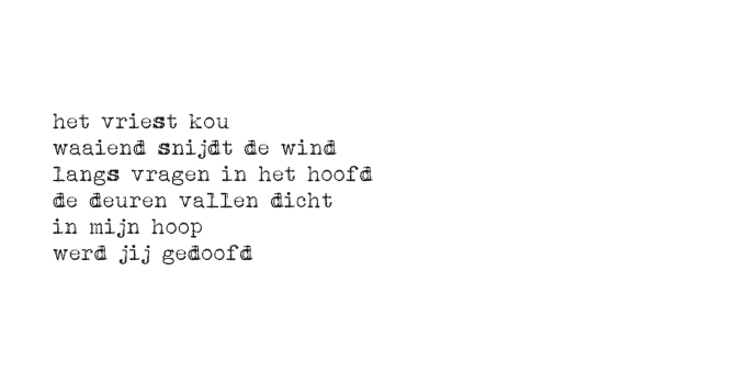 Barbara Trienen (Goor, 1992) studeert Fotografie aan de Fotovakschool in Apeldoorn. Op dit moment loopt ze stage bij fotografe Hanne van der Woude. Naast fotograferen heeft ze nog een andere passie: dichten. De selectie onderaan deze pagina is afkomstig uit een nog naamloos project, waarbij Trienen beelden zoekt (en schiet) bij de gedichten die ze heeft geschreven. Of, poëtischer gezegd: na de poëzie komt het poë-zien.