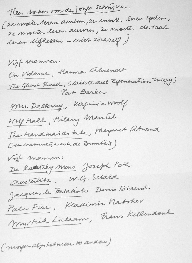 Het is eigenlijk achterlijk dat in deze lijstjes op de website van HP/De Tijd zo weinig vrouwen voorkomen. Mannen kiezen mannen. Mannen zijn monomane lezers, ze kijken veelal neer op door vrouwen geschreven werk. Vrouwen zijn nieuwsgieriger en opener. In haar Anna Bijns Lezing heeft Lionel Shriver dat weer eens krachtig verwoord. Vrouwen waarderen zowel mannelijke als vrouwelijke auteurs. Vandaar dat in mijn lijstje ook mannen voorkomen. Voor mannen geldt dat omgekeerd niet.
