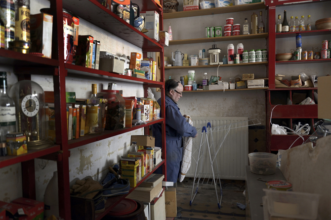 De winkel is nog gewoon in gebruik, door Frans zelf. Tussen het winkelassortiment hebben Frans z’n eigen spullen een plaatsje gekregen. De dagelijkse levensmiddelen en de post. Op een lage rode plank staan Frans z’n toiletspullen, de brylcreem en de scheerzeep. Hij gebruikt de brylcreem van zijn voorraad haarpommade, die op een hoger gelegen plank staat. Daarnaast, bij de trapopgang, hangen aan de kapstok twee schone lichtblauwe overhemden, een stofjas en een beige regenjas. In de winkelruimte wacht soms een ‘duifke in een kooike’, want Frans houdt postduiven. En hij stalt er het duivenvoer. Ook droogt hij er wasgoed aan een rekje. De winkel is het verlengde van de naastgelegen woonkamer. In de achterkamer aan de eettafel, genietend van zijn duiven, drinkt hij zijn koffie. Frans heeft veel verhalen. Over de winkel en hoe het vroeger ging. Over zijn familie, met foto’s erbij. Over zijn prijswinnende duiven en het duivenkrantje. Over zijn ziekenhuisbezoek en operaties. En over het ‘meiske’ dat hem altijd zo goed hielp in de winkel en nog vaak bij hem op bezoek komt.”