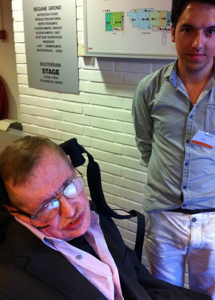 Op 23 mei 2014 was Stephen Hawking – volgens velen een van de briljantste natuurkundigen aller tijden – in Utrecht om op de Natuurkunde Olympiade PLANCKS een lezing te geven. Ik was een van de vijfhonderd mazzelaars die bij de lezing aanwezig mochten zijn en kreeg aan het eind van de bijeenkomst zelfs de gelegenheid om deze bijzondere man te ontmoeten. Een vraag stellen lukte niet – Hawking praat via een spraakcomputer en een spontane vraag beantwoorden kost teveel inspanning. Toen ik als een ware groupie vroeg of ik met hem op de foto mocht, knipperde hij met zijn ogen. ‘Stephen says it is okay’, zei zijn verpleger. Ik was zo blij met de foto dat ik er pas thuis achterkwam dat ik mijn gulp open heb staan en mijn overhemd heel raar in mijn broek zit gepropt.