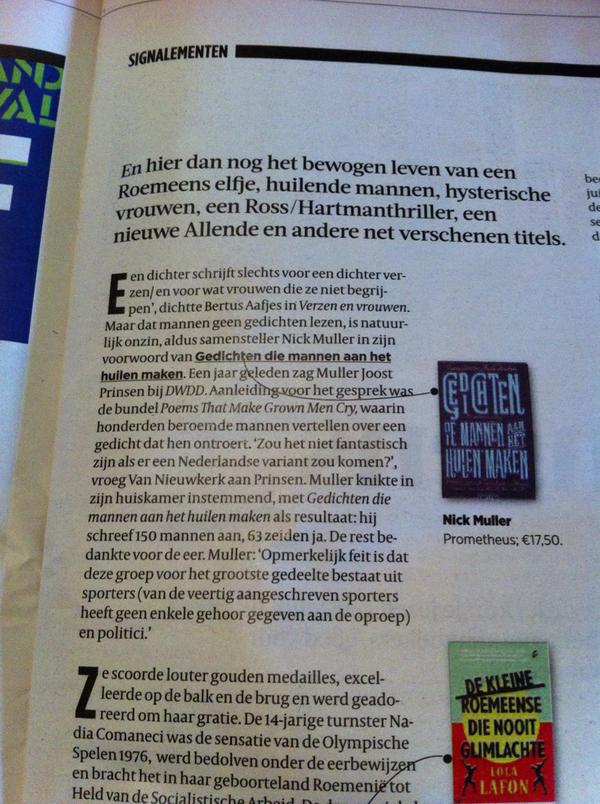‘Gedichten die mannen aan het huilen maken’ in de Volkskrant Aanbeveling voor ‘Gedichten die mannen aan het huilen maken’ in de Volkskrant, 30 mei 2015. Lezen via Blendle kan hier. Dit delen: Klik om te delen op Facebook (Opent in een nieuw venster) Facebook Klik om te delen op X (Opent in een nieuw venster) X Klik om dit te e-mailen naar een vriend (Opent in een nieuw venster) E-mail Klik om op LinkedIn te delen (Opent in een nieuw venster) LinkedIn Klik om op Tumblr te delen (Opent in een nieuw venster) Tumblr Klik om op Pinterest te delen (Opent in een nieuw venster) Pinterest Klik om af te drukken (Opent in een nieuw venster) Print Gerelateerd