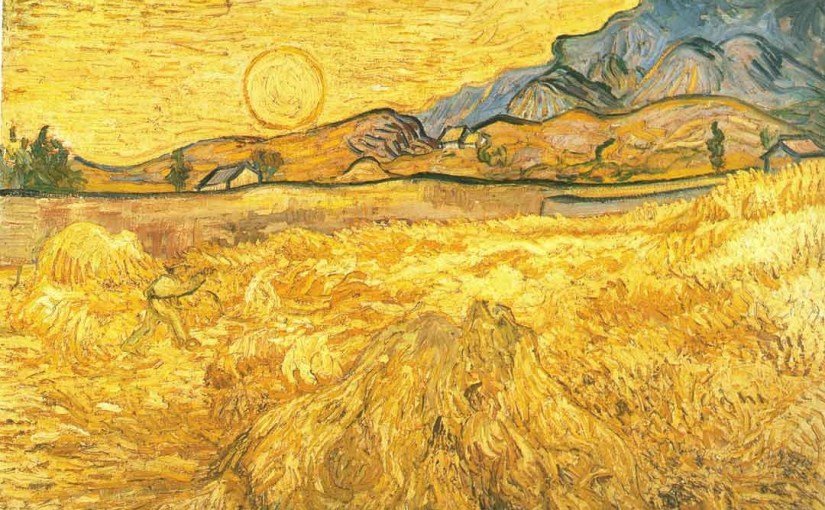 Aan de velden met het golvende, goudgele graan.